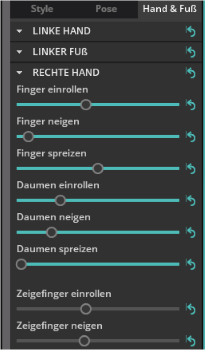 - Tab „Hand & Fuß“ – Tab mit feinen Einstellungsmöglichkeiten der Hände,