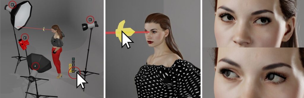 Wie bisher muss im Quick-Menü zunächst der Button mit dem Symbol „Augen in Richtung Kamera ausrichten“ aktiviert werden, damit das Modell in die Kamera schaut. Neben diesem Symbol erscheint nun die Schaltfläche zum Aktivieren des Bearbeitungsmodus, der „Look at Modus An/Aus“. Wenn dieser aktiviert ist, erscheinen Augensymbole neben der Kamera und bei jeder Lichtquelle. Durch Anklicken eines dieser Augen-Symbole kann das Modell nun auf das gewünschte Licht oder die Kamera schauen. Um die Blickrichtung individuell einzustellen, kann der gelbe Anfasser neben dem Modell frei bewegt werden. HIER gibt es ein kurzes Quicktipp Video.