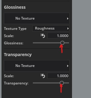 テクスチャのさまざまなスロット (カラー、標準、光沢) は、必ずしも埋める必要はありません。 したがって、たとえば、オブジェクトに光沢マップが含まれていない場合は、このスロットを空のままにし、スライダーを設定するだけです。