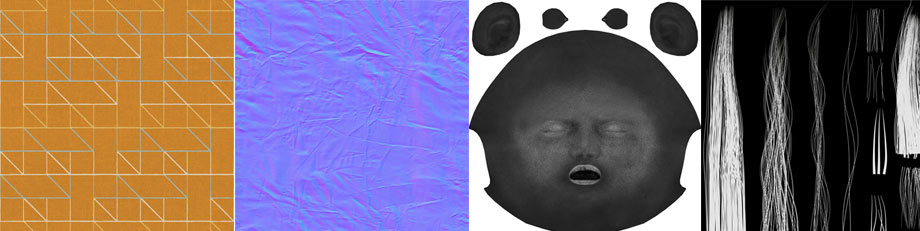 上で説明したように、カラー、法線、光沢マップ、カットアウトなど、さまざまなタイプのテクスチャがあります。