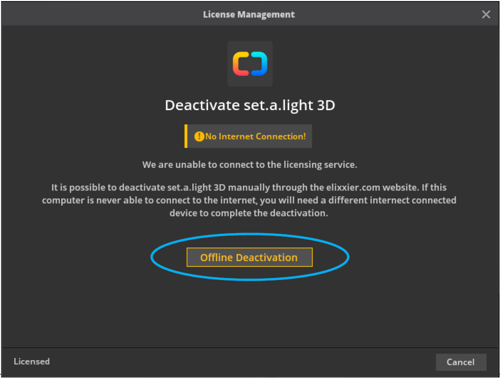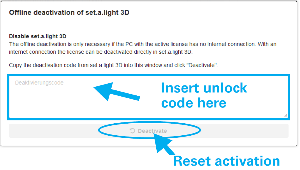 3. 停用后,您可以在另一台计算机上重新激活 set.a.light 3D。