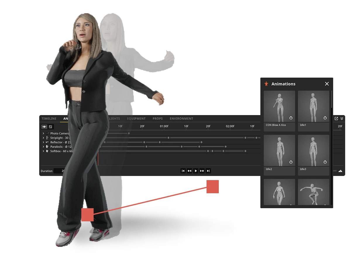 使用内置角色动作安排场景并预可视化动作——易于使用且直观。