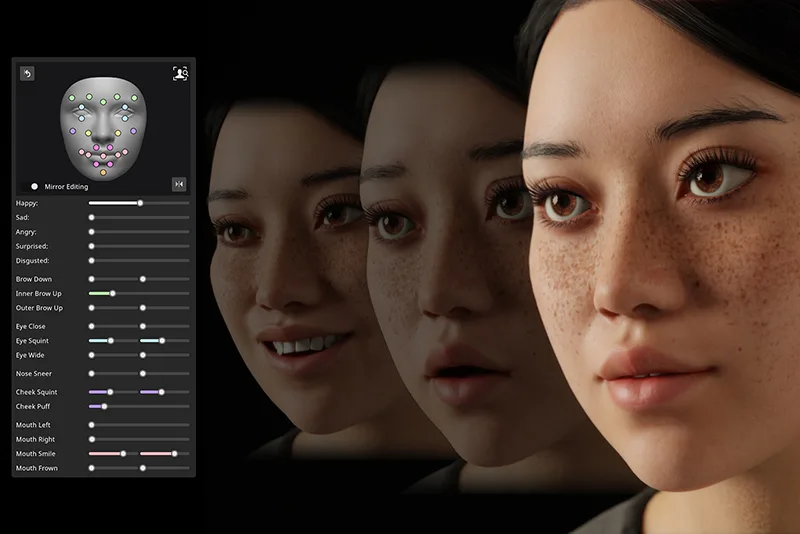 自定义面部表情以捕捉任何情感——从细微变化到戏剧性效果。从现成模板中选择,或使用表情面板进行微调。