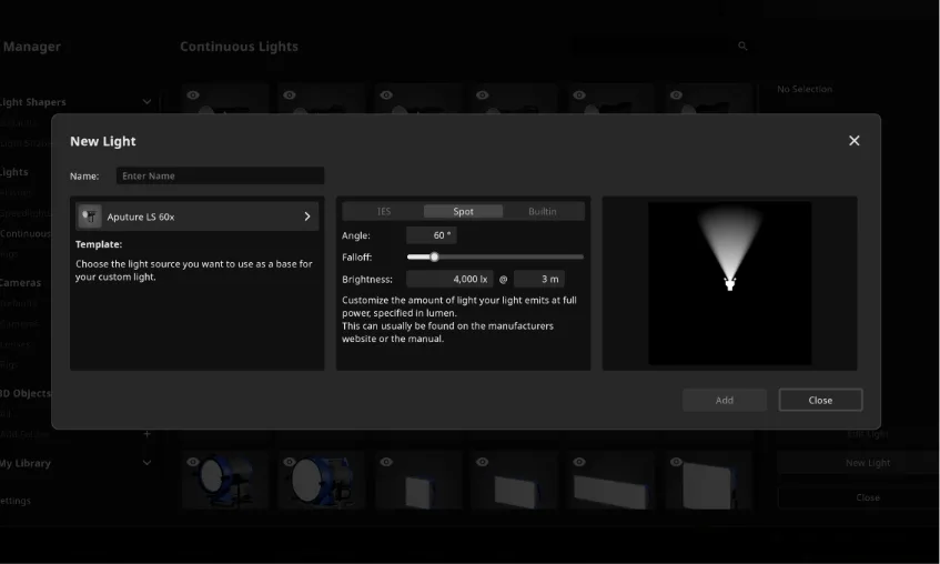 创建自定义闪光灯和持续灯以匹配你的设备(支持 IES 导入)。