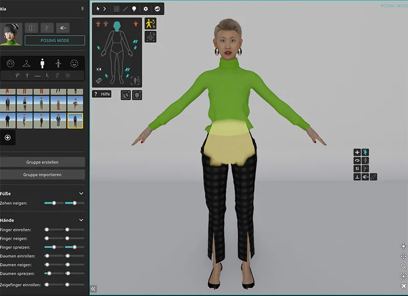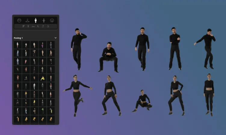 设置与你的场景匹配的姿势——从细微调整到富有表现力的姿态。从姿势模板中选择,或在姿势模式下创建你自己的姿势,并保存以备将来使用。