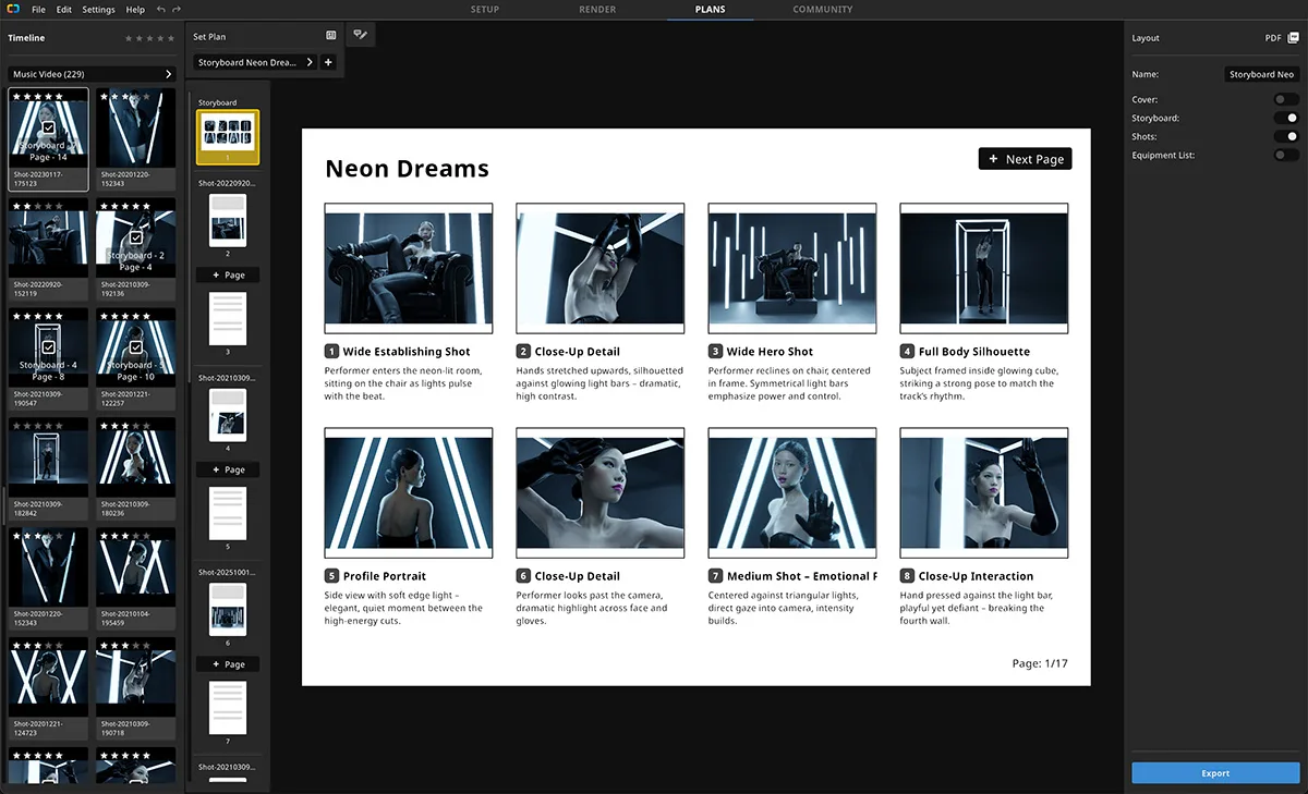 需要为你的拍摄制定计划吗?将可用于制作的场景蓝图导出为 PDF 或 JPG,以便在片场轻松重现你的愿景。每个计划都包含你快速上手所需的所有基本信息——可供打印和分享。