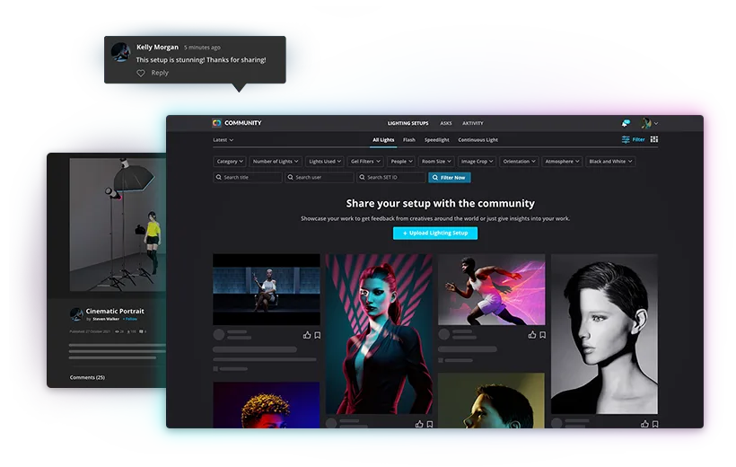 访问全球用户分享的海量灯光设置库,获取灵感。无论你热爱摄影、电影制作还是视觉叙事,你都会找到激发你创造力并帮助你成长的设置。